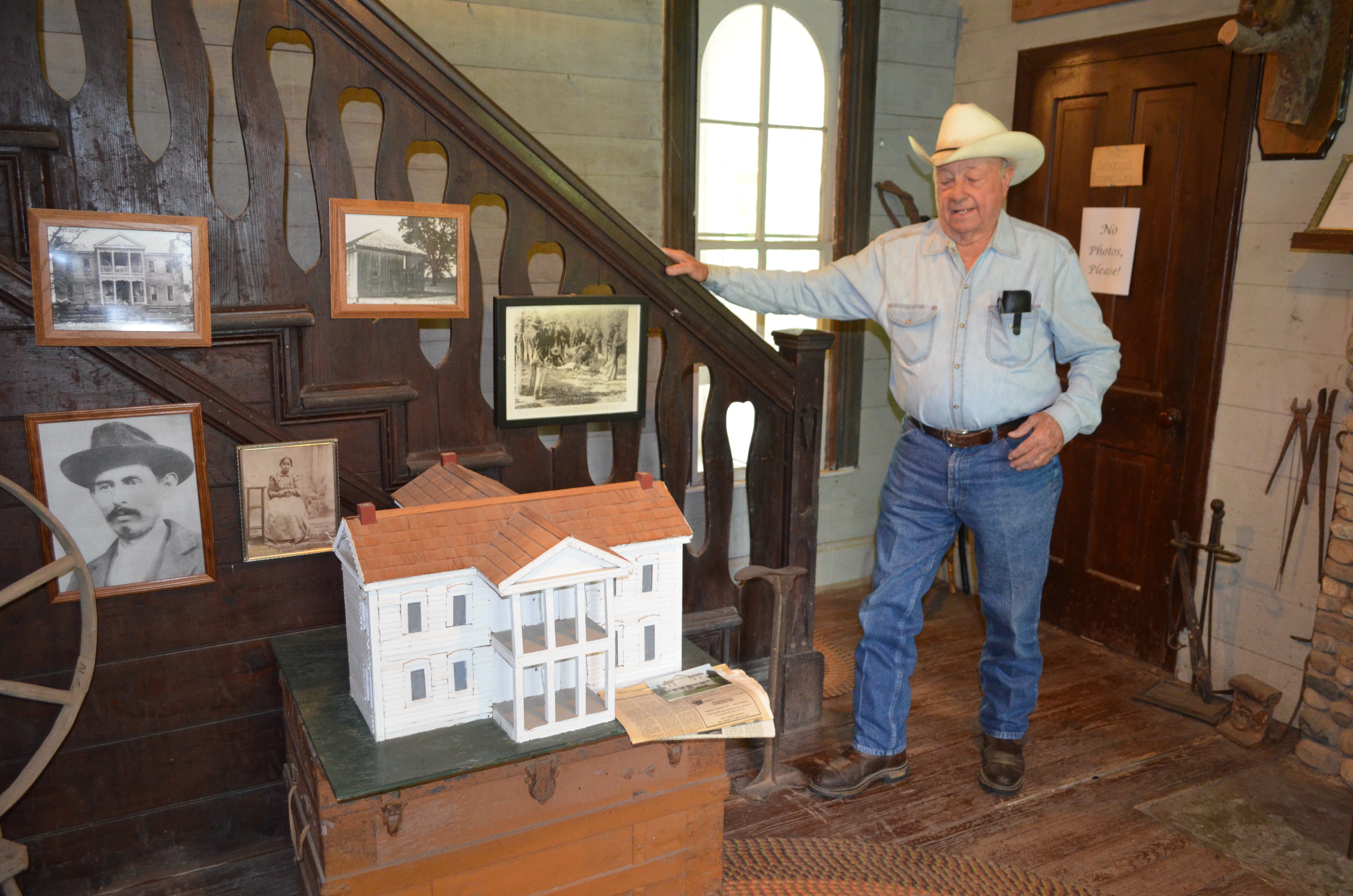 After a bit, I guess we passed muster, so we were taken into the main house. I’m not sure if you get past the porch if he doesn’t trust you. He unlocked the door and we entered the main areas where there were more artifacts to see. In the kitchen, I found lots of old utensils and dishes of the era. In the living room, he showed us a model of the house and photos of Chief Gardner and others, telling stories of the indians as we looked around. Here’s Mr. Stiles showing us some items, including the hand-carved staircase and other Choctaw craftsmanship used in the home…