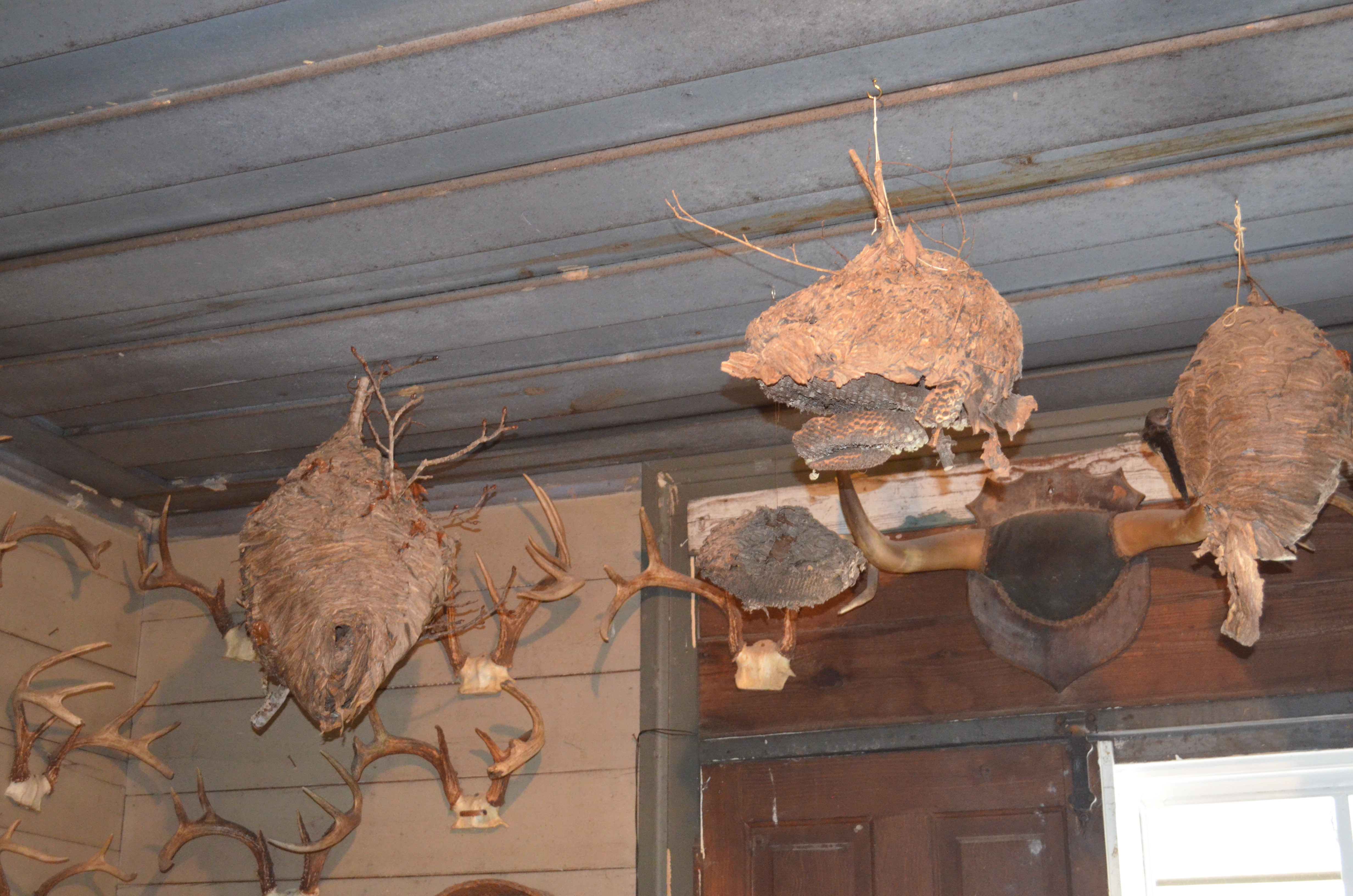 Once again, I guess we asked the right questions, because we were taken upstairs. There was a treasure trove of indian artifacts including ancient tools, arrowheads, and natural items from the land. I stupidly didn’t see the signs in front of me saying no pictures, so I took a few. Later, I apologized to him, but he said it was ok. He didn’t want too many getting out because the items are quite valuable. Not like he has a security force there, so I understood and won’t pass those along. Here’s some of the hornet nests he’s collected during his life (he’s been on the property since he was 5)…
