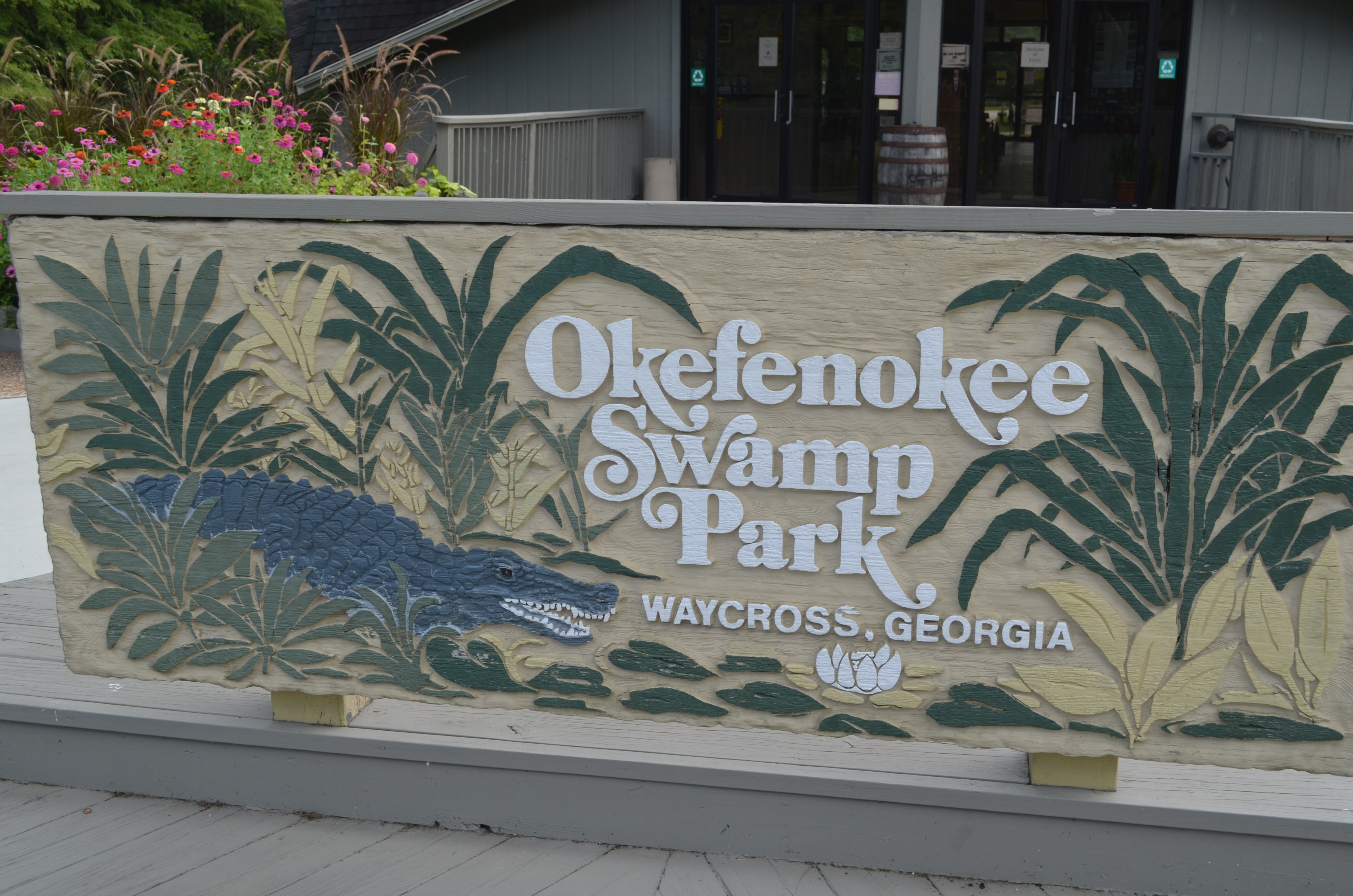 After leaving Savannah, we were driving through rural Georgia, kind of cutting across the state, and saw Okefenokee Swamp on the map. I’ve heard of Okefenokee all my life. It was the site for all the Pogo cartoons and there were those movies where people sank in the quicksand back in the Okefenokee and it’s just fun to say it. In the area where we were was a privately owned park in the national wildlife refuge, so we just cut off the road and went there. Fearing an overly done theme park, we were delighted to find a small park that seemed part of the natural area. We were too late for the boat tour but signed on for the train back into the swamp. Why were we so obsessed with swamps all of a sudden? And here are the signs we were greeted with…