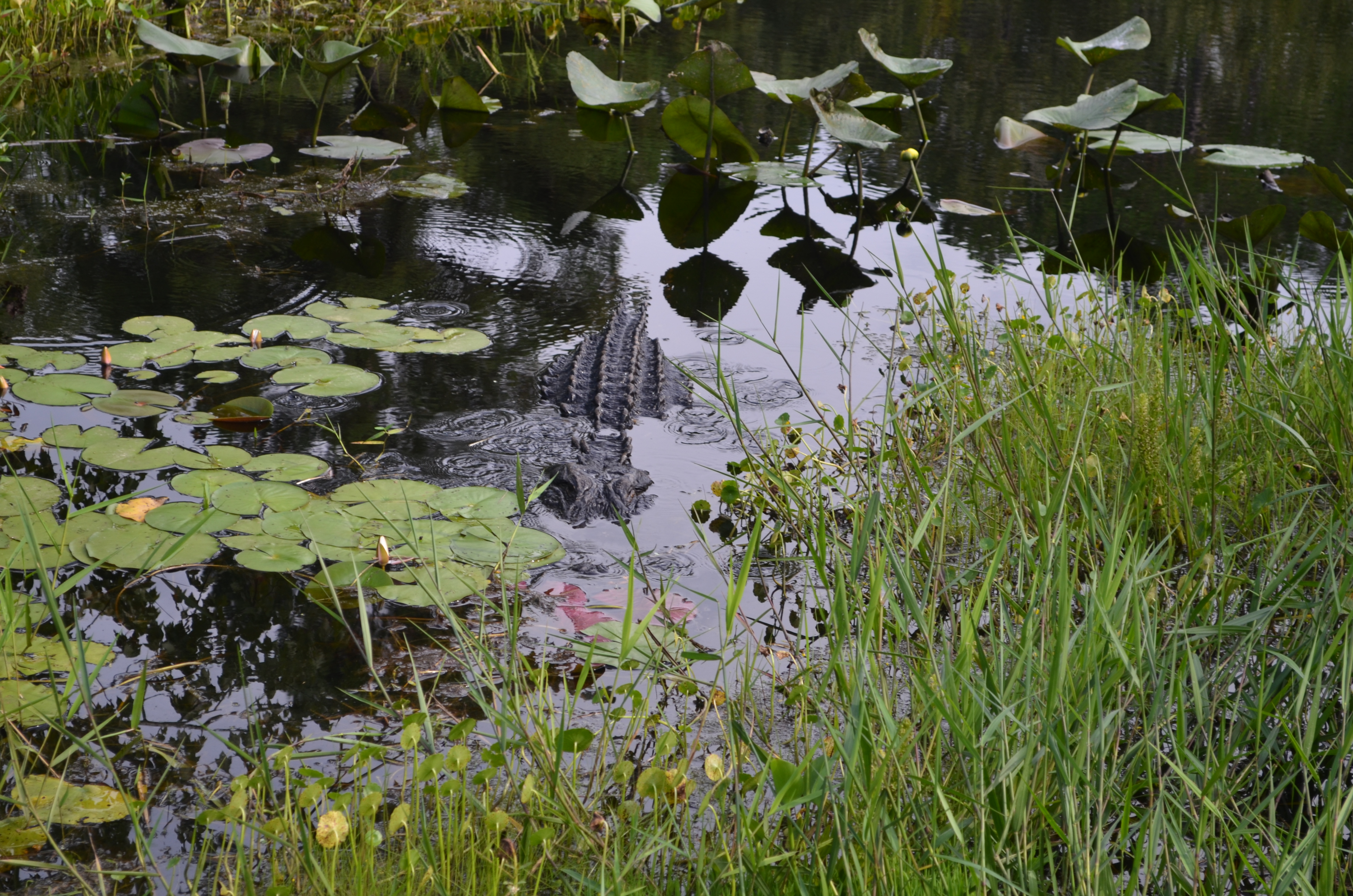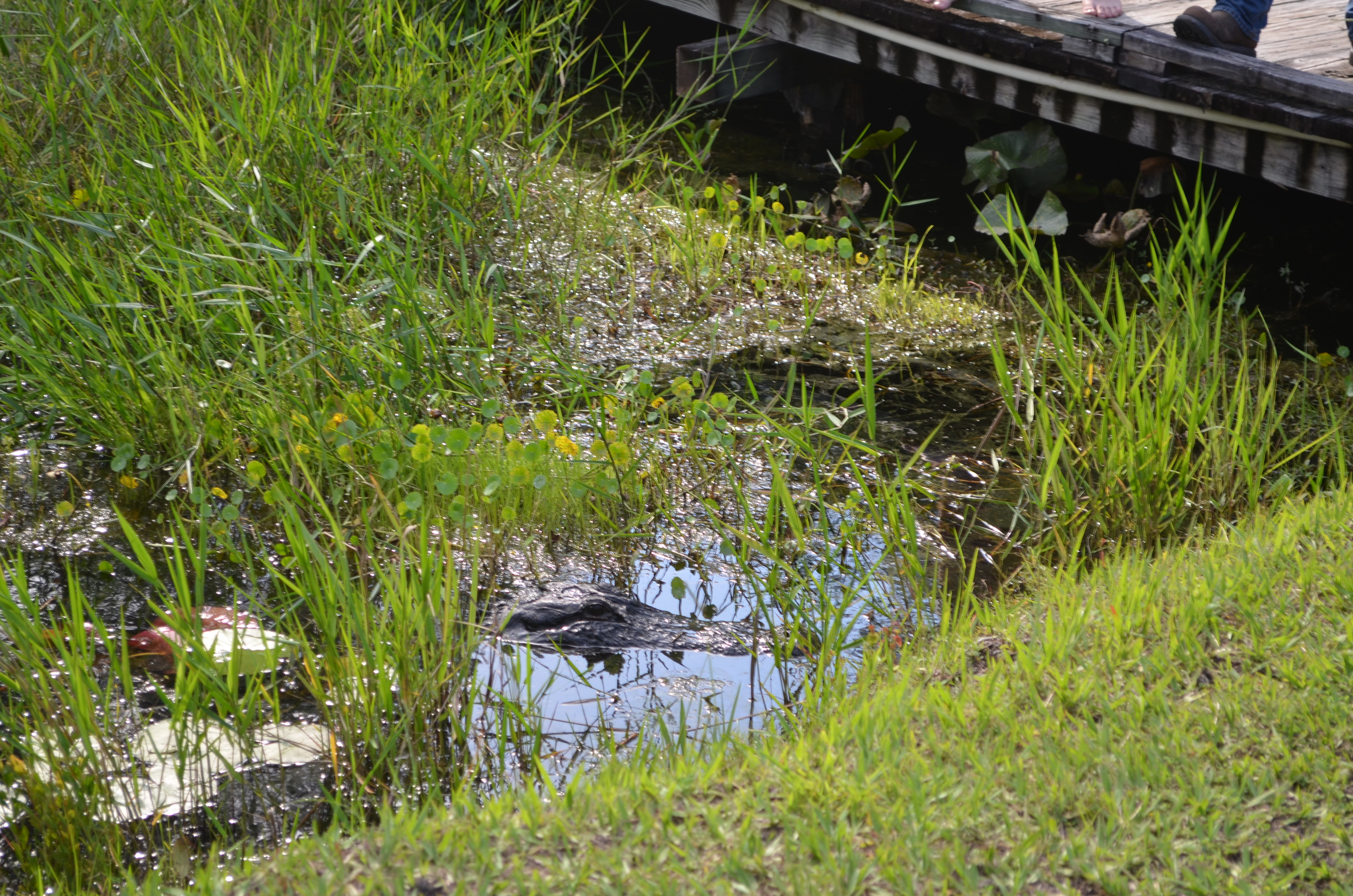 We decided that was close enough to the wildlife and, with great respect, headed towards the car. While crossing over the little bridge, I spotted this one coming towards me. They say you can tell the size of an alligator by the space between their eyes. 6″=6′ I didn’t stop to measure.