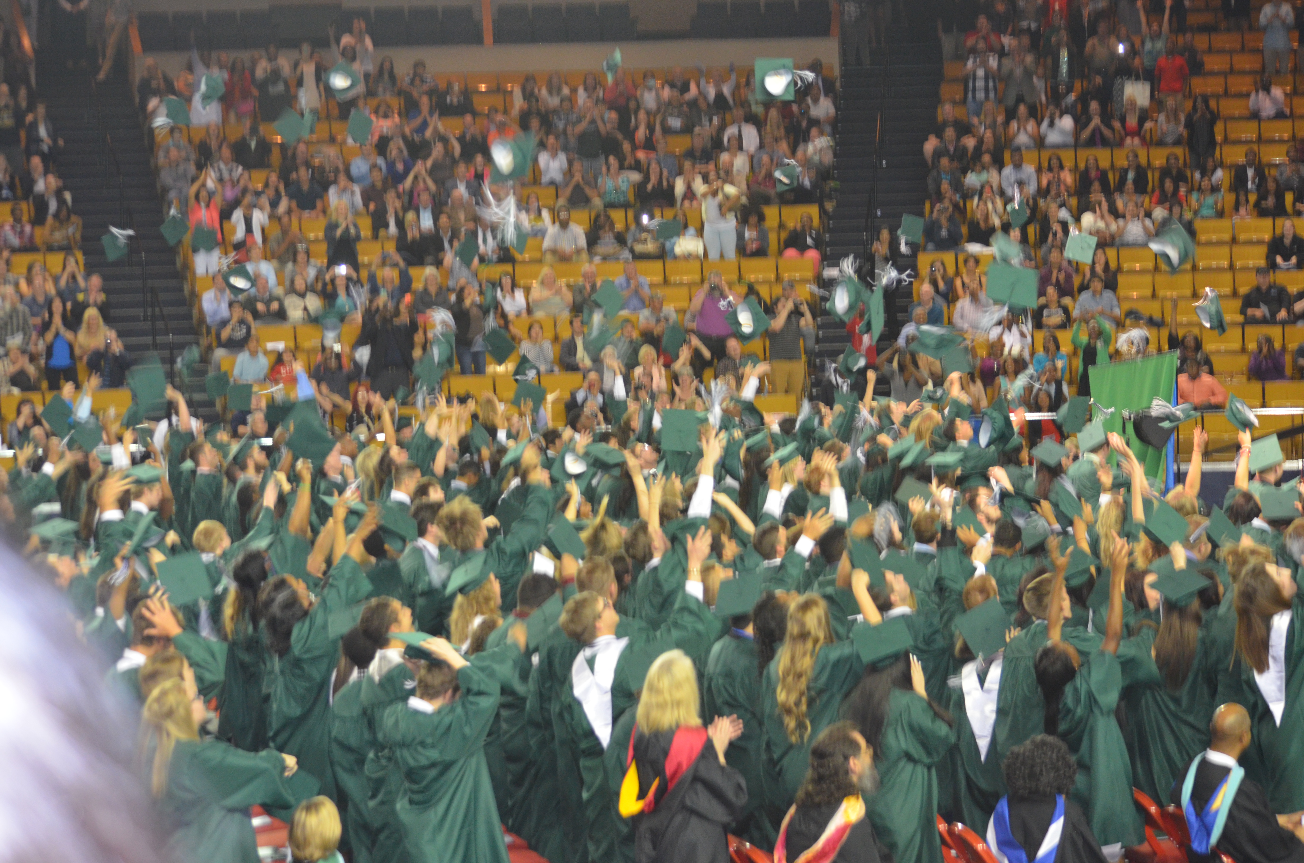 When I watched the seniors proceed to their seats to the music of the student orchestra playing that familiar piece, I saw them all looking around. There were shouts and cheers and applause from family and friends as they entered the rowdily dignified atmosphere that is a graduation these days. They all were looking for the familiar faces of those they love, those who were here to celebrate their success. They all wanted to know where their parents, grandparents, relatives and friends were. That says something about the experience, doesn’t it? In this picture, my grandson has spotted his parents. His look says it all.