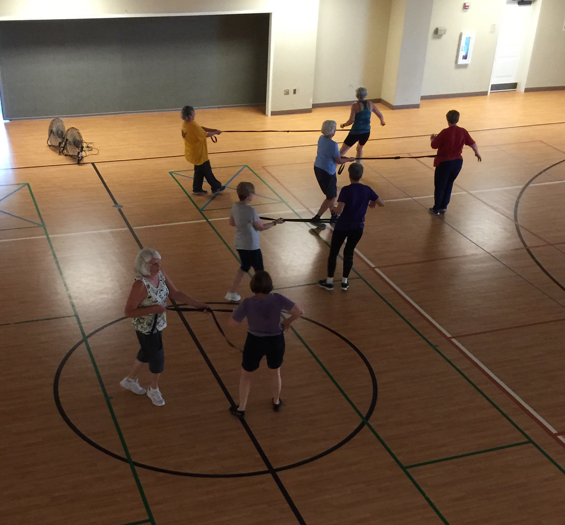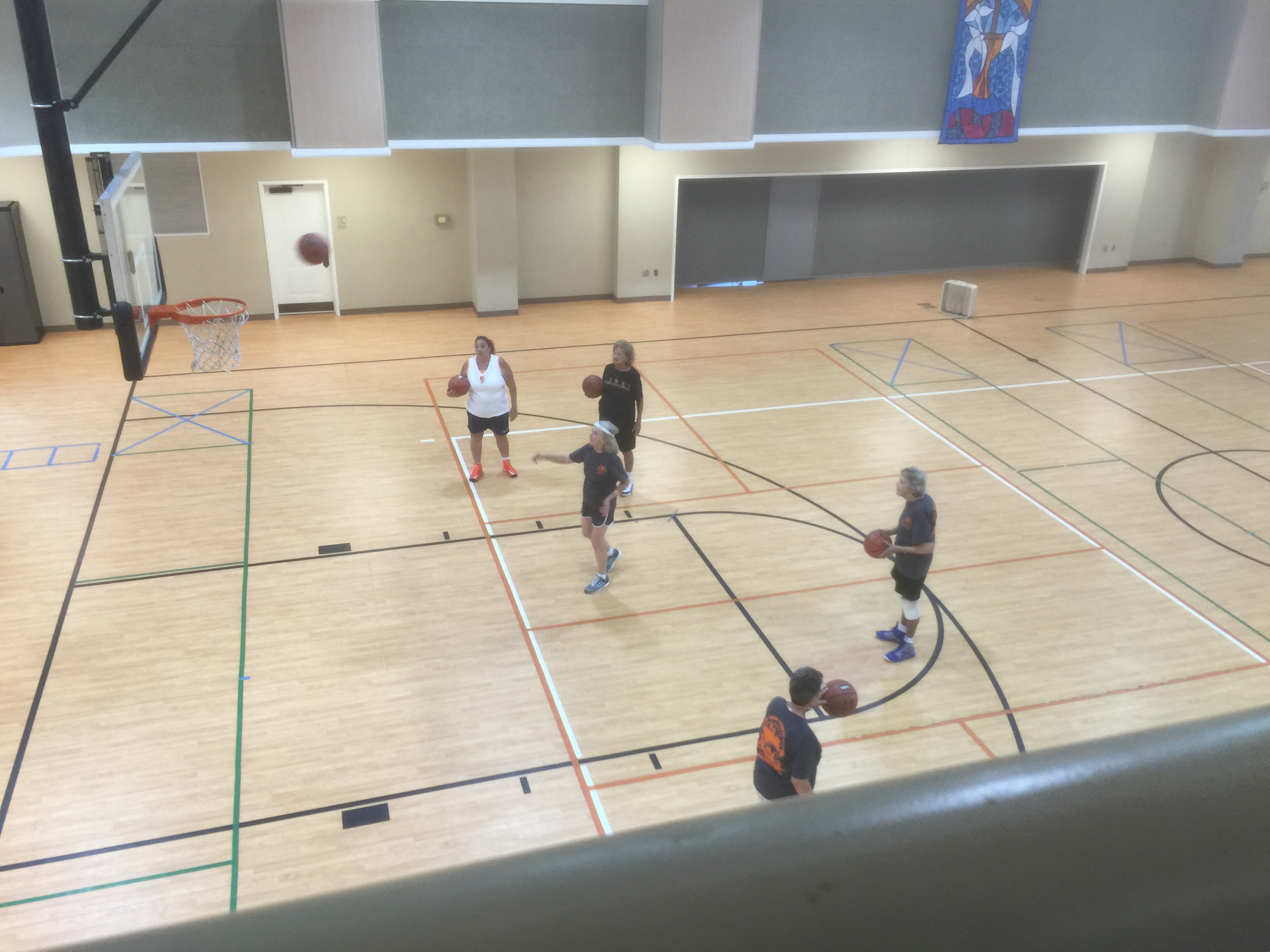 IMG_7773At the end of a game, the players meet at the net to touch paddles and tell each other what a good game it was. Very fun. You’ll note the knee brace on one player. I watched a game stop for a minute last week when a lady’s pacemaker came undone. She hooked it up and kept playing. She’s another very good player.IMG_7781From my walking vantage point, I watch some of the other activities, such as Tai Chi, a great activity for balance and strength. There is also Zumba Gold, a low impact dance exercise class. Watching these ladies, listening to the variety of music to which they were moving, I realized that these ladies were always dancers. They did ballroom, swing, cha cha and rhumba, Western line dances, and rock & roll. These ladies did the Twist when they were young and now they’re moving to those same tunes. They cooled down to Frank Sinatra after some faster numbers and I thought of how many dances they had been to in their lifetimes and how many of them were probably dancing without their life long partners these days since the women do tend to outlive the men, no matter what we’d like to think. The memories moving to this music must bring to mind…IMG_7725Another day, I walked my two miles very quickly, watching a Functional Movement class that made me tired to think about. These ladies were bending and pulling in ways that I’m not sure I could do or even want to try, although I should. In this one, they walked with a partner who pulled on the giant rubber band to give them resistance. That’s not so bad, but the floor exercises…IMG_7782Today, I walked while the basketball teams warmed up, watching gray and white haired ladies make basket after basket as they practiced their drills. I don’t know if they played a game or not, but the drills were fun to watch. They all arrived with their own basketballs, which is so amazing to me, although I have my own Pickleball paddle now.IMG_7813These aren’t the only ones moving or active around the place. There is a small gym with exercise equipment, Yoga, and seated exercise and seated Yoga classes which are always full, plus activities for the mind. There is Bridge, Mah Jongg, Skip-Bo, Canasta, a knitting group and a painting group. One of my friends goes to a group called Stories, where people meet to share memories and stories. Some of them bring things to read, others tell stories, some share things they have written. One lady in her 90s reads poetry she writes. There are several 90+ year olds in this group with a great collection of memories to share. And, of course, there are Pot Luck lunch on Fridays.