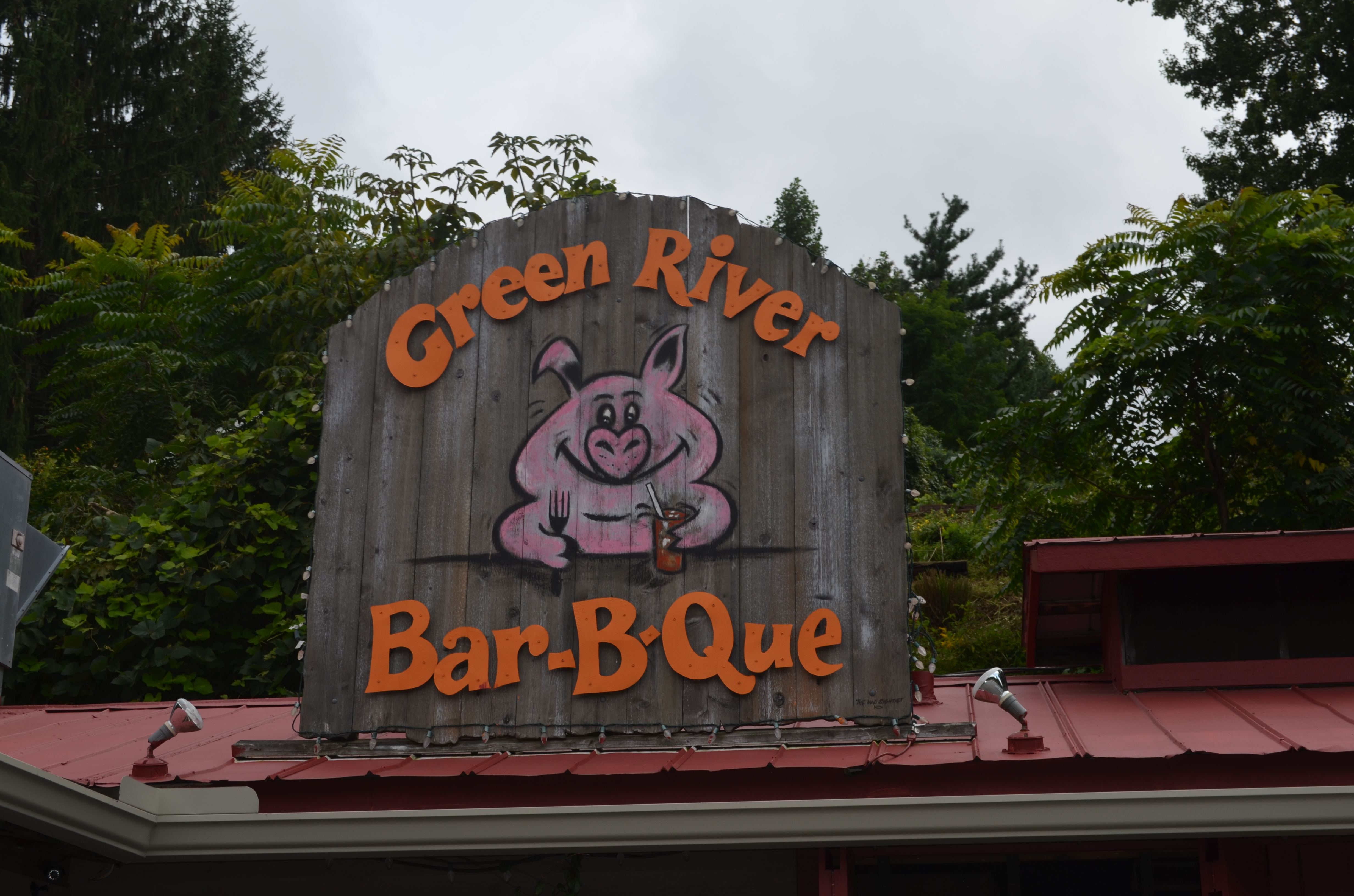 The next day, we left the interstate in North Carolina and traveled a back road that took us through Saluda, a tiny town that actually has a thriving artist community. One of their local festivals is Coon Dog Day. We stopped at this place and had terrific barbecue because we were still in that mode and delicious Vidalia onion slaw. I think I could make that – marinated Vidalia onions with a slaw dressing.