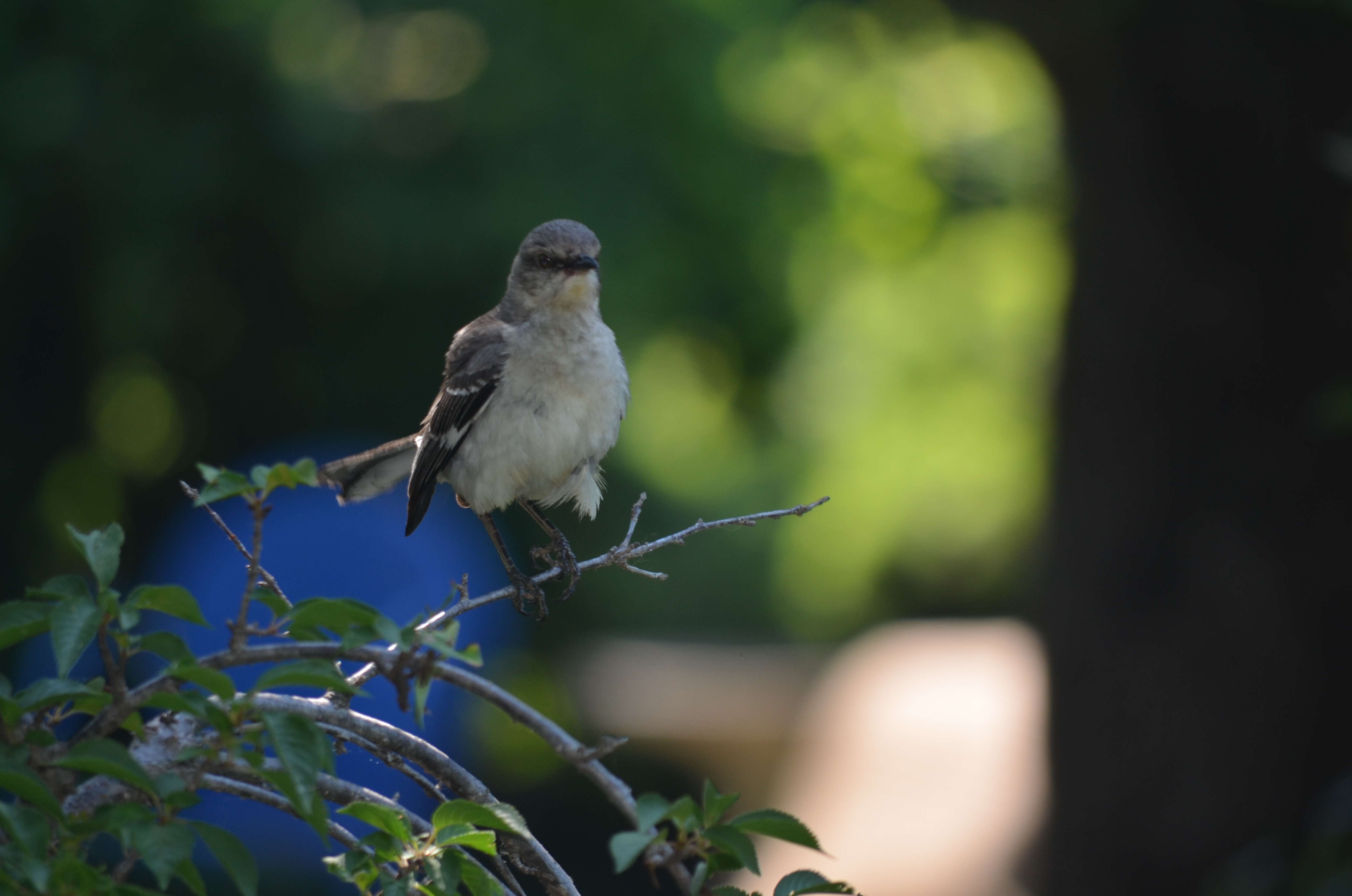 For the past few weeks, every time my cats decided to sunbathe on the deck on their favorite chair or glider, a Mockingbird would fly down and perch about a foot from them, giving them a warning round of chirps. The bird was pretty intense andthe cats just laid their ears back and took the abuse.  I knew there was a nest nearby and the cats were getting warned.