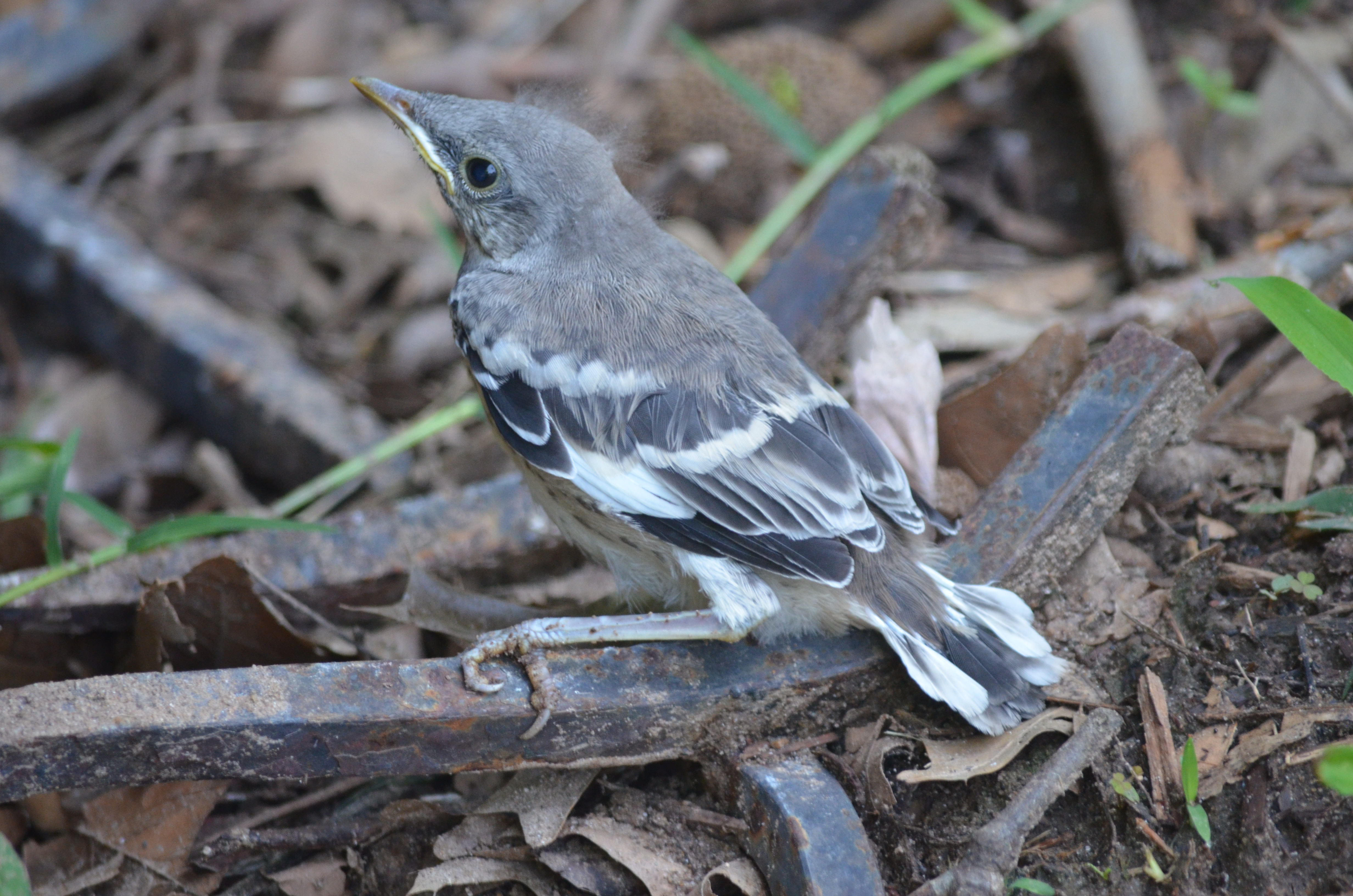 Today, it happened.  I don’t know where the nest is, but the babies all appeared in my yard, four of them, flopping their short wings in an attempt to fly.  When I stepped outside, the mother was watching overhead, trying to help them as she could.  The first two I saw were by the fence, hopping and flapping.  This one finally made it down the yard, through the fence and up to a branch about a foot off the ground in the yard next door where my dogs can’t get it.