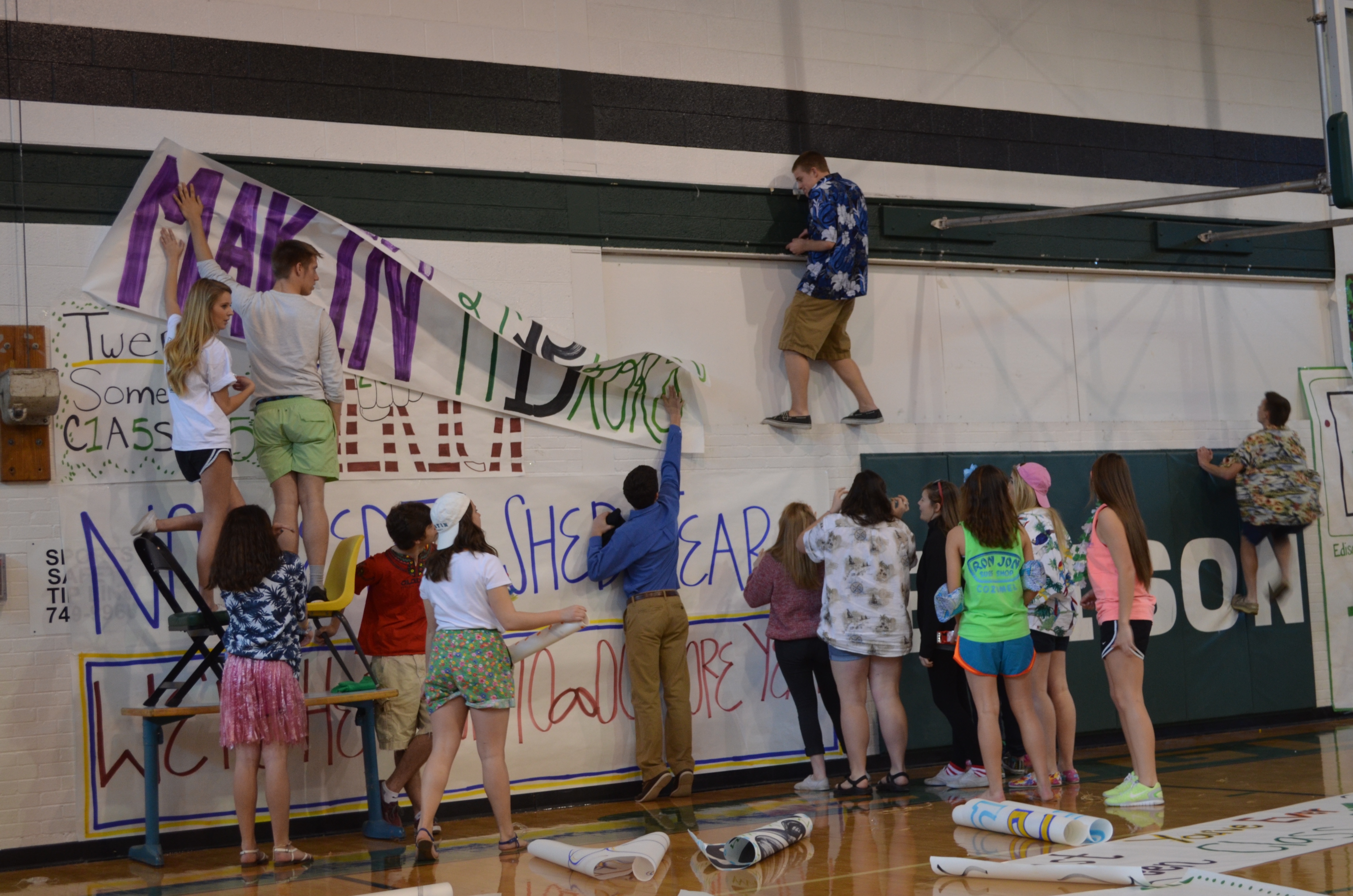 …just as they do today.  This picture is a great illustration of the teenage boy’s brain as he improvises a way to hang a banner by balancing on a 2 inch brick when standing on a chair on a table didn’t work.  There were ladders close by, by the way.