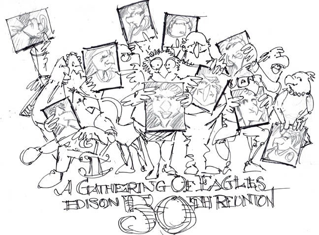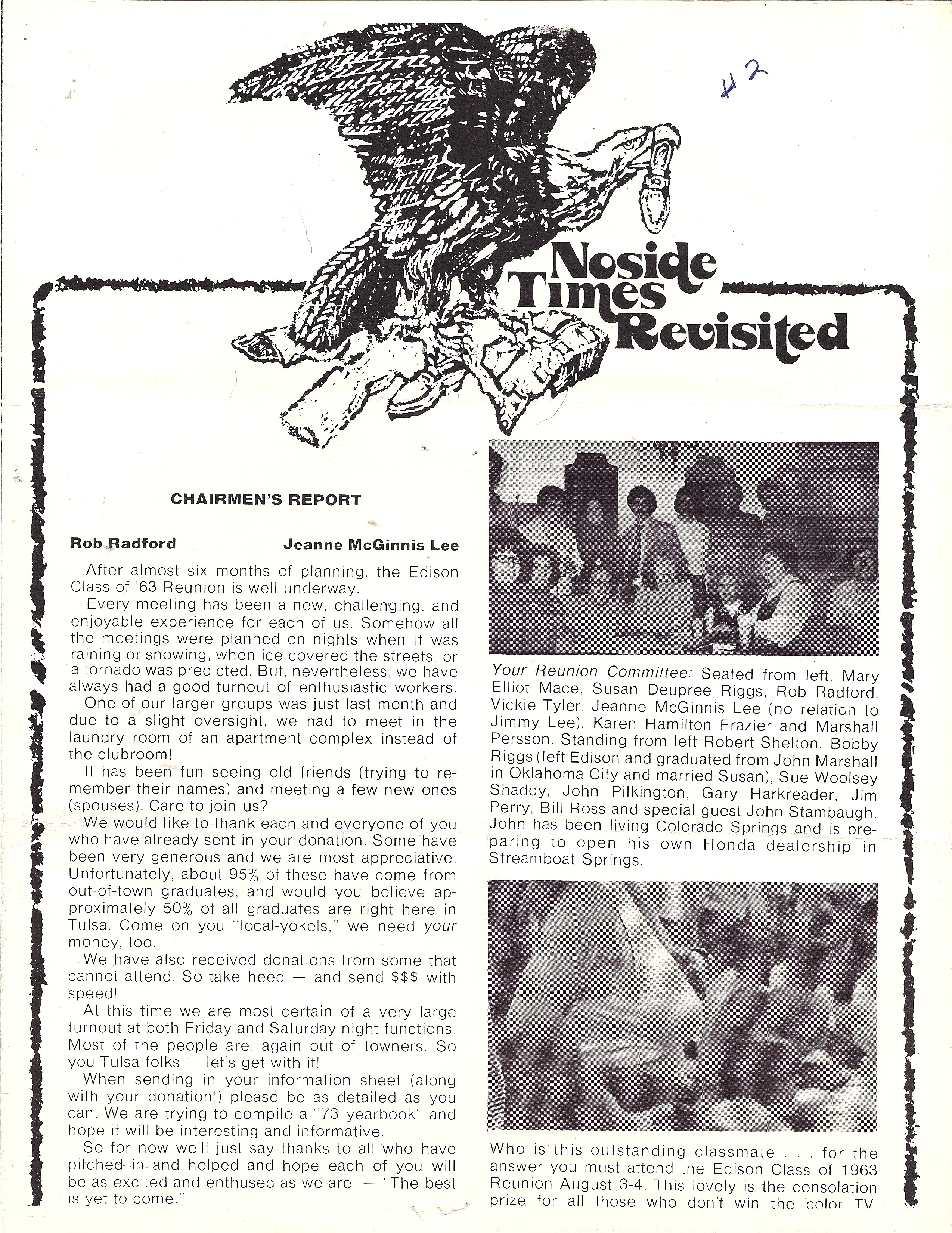 The 10th reunion was in 1973. The committee had to have calling sessions to find everyone, using our high school directory to call parents’ homes, phone directories, information. We sent out newsletters, printed with a fun logo drawn by one of our artist classmates, using the name of the student paper when we were in school. We worked hard to find everyone we could. The excuses for not coming that year were mostly due to lack of funds or having babies, we were in our childbearing years. Actaully, I had just had my third child a few months before – there were many of us with new babies on the committee. We ended up with about 200 attending, including spouses. We had lost some classmates and found out that some of the people we knew really hated high school and never wanted to remember anything. Many came home to see family while they were at the reunion.