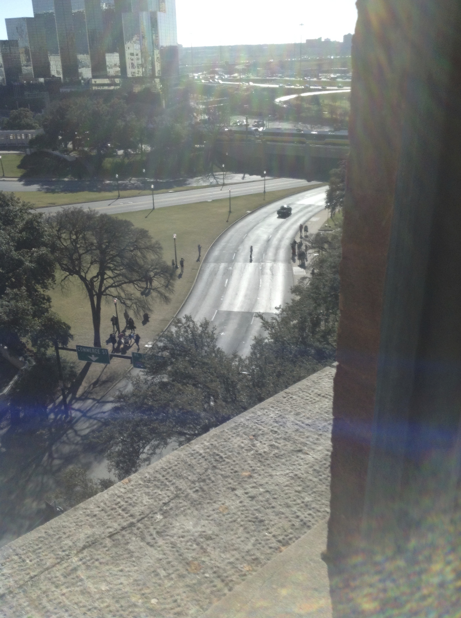 There are places that you visit that are instantly familiar, instantly brought to life from the images you’ve carried with you, and Dealey Plaza is one of those. The only thing that is really different is that we watched it all in black and white in 1963 and this was a bright sunny Texas day, the site coming alive with color. The trees, young in the Zapruder films, are now 50 years older and obscure some of the views. Turning to look at the former Texas School Book Depository, looking up at the window, I felt a twinge, an eerie feeling inside.